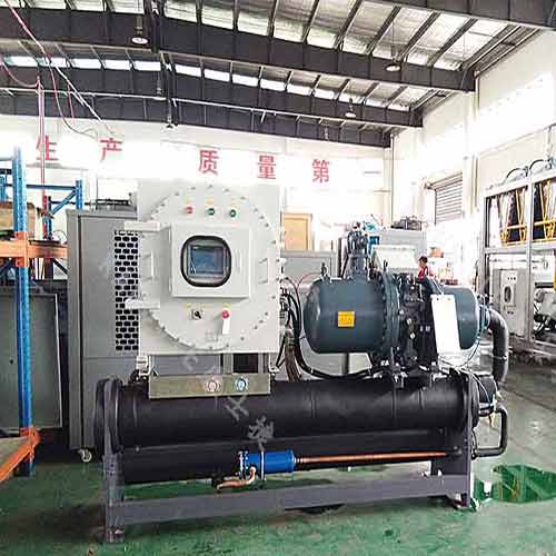 制藥業控溫用乙二醇螺桿式防爆冷水機組是以螺桿式壓縮機提供動力的低溫控溫設備,用于易燃易爆場所。