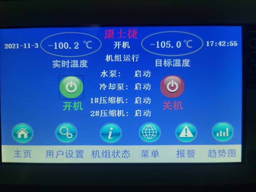 康士捷生產的-100度超低溫制冷機組 復疊式冷凍機組采用二元復疊就可以達到零下100度,在公司試運行4個小時,運行穩定。正負溫度5度,低溫度可達-105度。